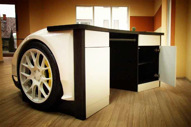 Beautiful and creative office desk made by Design Epicentrum looks like a Lamborghini Murcielago sports car. The Lamborghini Murcielago Desk is just what the name suggests. The imposing front nose of Lamborghini‘s previous flagship serves as the base for the desk. There’s a glass top supported by stainless posts for the business end of the desk. Behind the headlights are drawers and a small closet for storage.